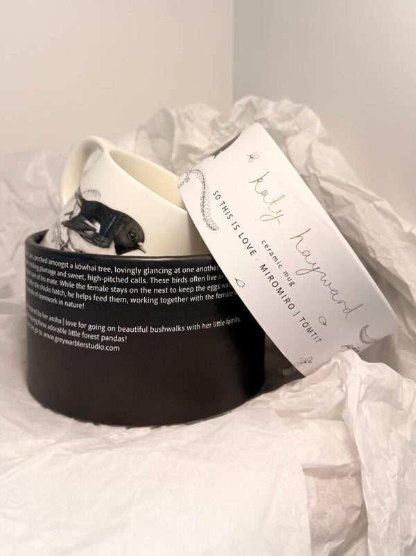 ‘So this is love’ features a male and female miromiro | tomtit pair, perched amongst a kōwhai tree, lovingly glancing at one another.